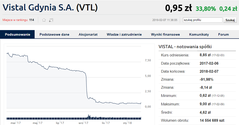 Tak istotne wydarzenia doprowadziły wtedy nawet do zawieszenia obrotu akcjami spółki. Ostatecznie notowania Vistalu zostały jednak „puszczone”, a spółka zanotowała ogromną przecenę. W sumie w ciągu zaledwie kilku dni kurs spółki zanurkował o blisko 70%. Nieco później banki, jeden po drugim, zaczęły wypowiadać kolejne umowy kredytowe Vistalu, co doprowadziło nawet do złożenia przez tę spółkę wniosku o ogłoszenie upadłości.