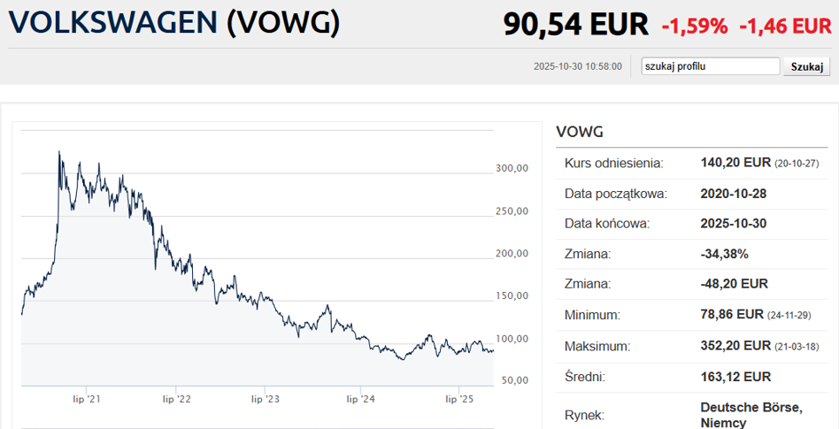 W III kwartale 2025 r. koncern z Wolfsburga poniósł stratę operacyjną w wysokości 1,3 mld euro w porównaniu do zysku na poziomie 2,8 mld euro w analogicznym okresie ubiegłego roku. Analitycy spodziewali się straty w wysokości 1,7 mld euro.
