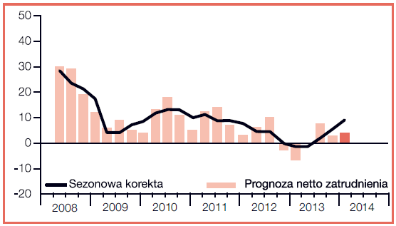 W 2014 roku możemy spodziewać się niewielkiego polepszenia sytuacji na rynku pracy. Trend ten jest zauważalny już od kilku miesięcy i wynika z umiarkowanej poprawy koniunktury makroekonomicznej. Nie należy jednak oczekiwać przesadnej "prosperity", ponieważ wychodzenie kraju ze stagnacji jest łagodne, a reakcja rynku pracy na ożywienie gospodarcze odznacza się opóźnieniem.