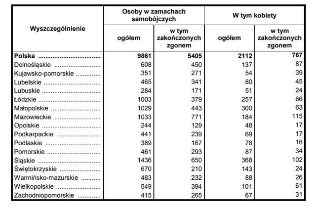 GUS przedstawił raport dotyczący samobójstw w Polsce w 2016 roku. W przeliczeniu na 100 tys. mieszkańców wskaźnik samobójstw był najwyższy w województwie świętokrzyskim, a najniższy w województwie wielkopolskim. - Najwięcej (771) prób samobójczych zakończonych zgonem odnotowano w województwie mazowieckim, najmniej (129) w województwie opolskim. W przeliczeniu na 100 tys. mieszkańców najwyższy wskaźnik samobójstw zakończonych zgonem odnotowano w województwach lubuskim oraz świętokrzyskim (blisko 17), a najniższy (ponad 11) w województwach podkarpackim oraz wielkopolskim - czytamy w raporcie GUS-u.