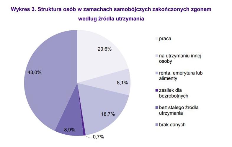 Jak wynika z danych GUS-u, samobójcy to najczęściej osoby nieposiadające stałego źródła utrzymania, następnie pracownicy i osoby przebywające na rencie lub emeryturze.
