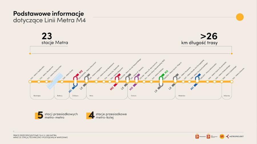 Będą na niej 23 stacje: Myśliborska, Obrazkowa, Płochocińska, Ruda, Marymont (przesiadkowa z M2), Rydygiera (przesiadkowa z koleją), Rondo Radosława, Cmentarz Żydowski, Okopowa, Rondo Daszyńskiego (przesiadkowa z M2), Plac Zawiszy (przesiadkowa z koleją), Plac Narutowicza (przesiadkowa z M5), Bitwy Warszawskiej 1920 r., Wiślicka, Żwirki i Wigury (przesiadkowa z M3 i koleją), Służewiec (przesiadkowa z koleją), Rondo Unii Europejskiej, Smoluchowskiego, Wilanowska (przesiadkowa z M1), Dolina Służewiecka, Patkowskiego, Sobieskiego i Wilanów. (PAP)