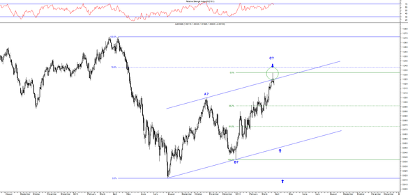 Analizując wykres AUD/CAD technicznie można dojść do wniosku, że kurs znalazł się w bardzo istotnym momencie. Rynek tej pary jest mocno wykupiony (wysoki poziom wskaźników impetu na danych dziennych), a notowania dotarły do ważnych oporów, tj. 1,0250. Na tym poziomie przebiega aktualnie górne ograniczenie hipotetycznego kanału wzrostowego (patrz wykres powyżej). Moim zdaniem techniczne uwarunkowania pozwalają prognozować odwrócenie trendu na tym rynku w najbliższym czasie. Pierwsze potencjalne zasięgi dla takiego scenariusza znajdują się na 0,9958 oraz na 0,9735. Geneza tych poziomów została przedstawiona powyżej. Zanegowaniem takiego wariantu będzie wzrost notowań analizowanej pary powyżej 1,0382.