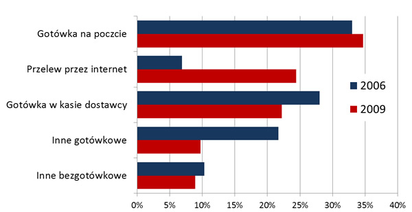 Źródło: Koźliński T., "Płatności masowe w Polsce – wyniki ogólnopolskiego badania reprezentatywnego przeprowadzonego w 2009 r. i ich porównanie z wynikami analogicznego badania przeprowadzonego w 2006 r.", Narodowy Bank Polski, 2010.