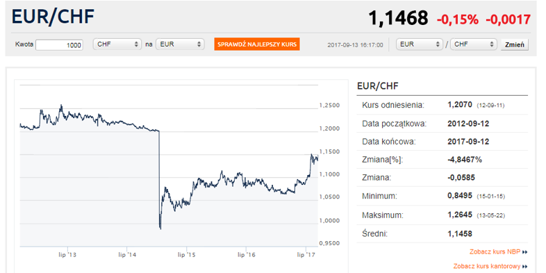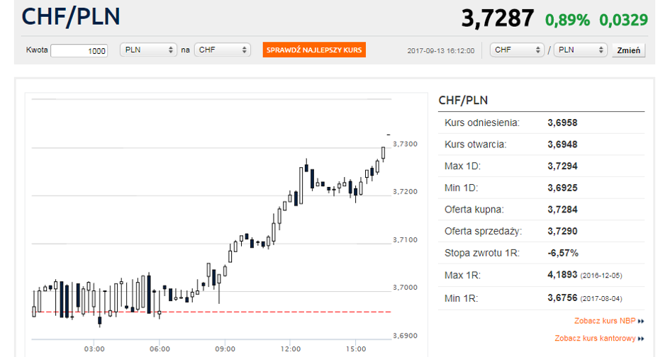 [Aktualizacja 14-09-2017 06:30] O przeszło 3 grosze drożał w środę względem złotego frank szwajcarski. W czwartek ważny dzień dla helweckiej waluty, decyzję o stopach ogłosi bowiem SNB.