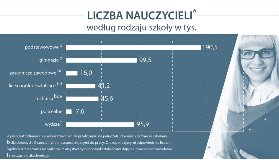 Największe grono pedagogów może świętować w szkołach podstawowych, jak bowiem wynika z danych GUS, w tych placówkach jest ich zatrudnionych 190 tysięcy. Na drugim i trzecim miejscu, z wynikiem bliskim 100 tysięcy, uplasowały się odpowiednio gimnazja i szkoły wyższe.
