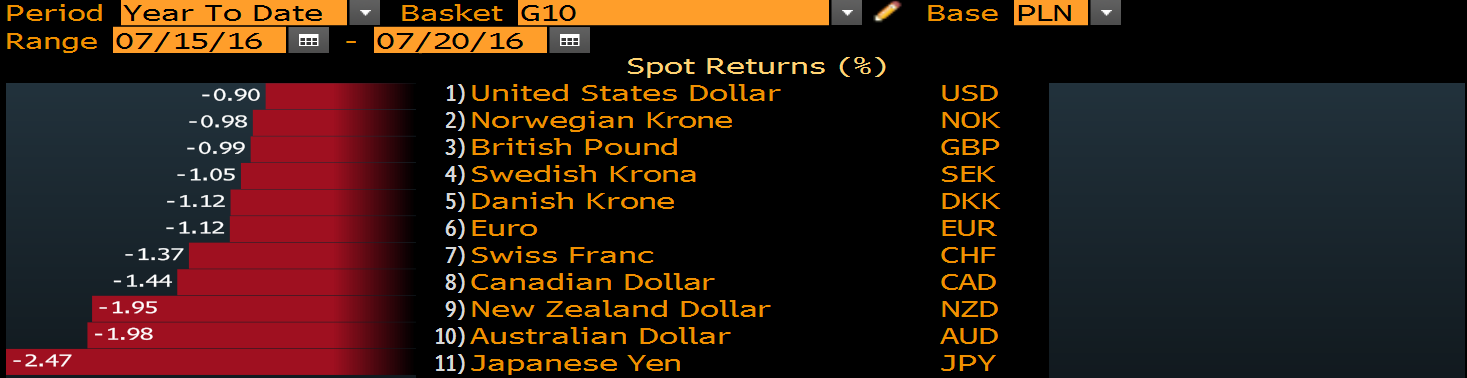Procentowa zmiana wartości walut krajów z G10 do PLN od początku tygodnia