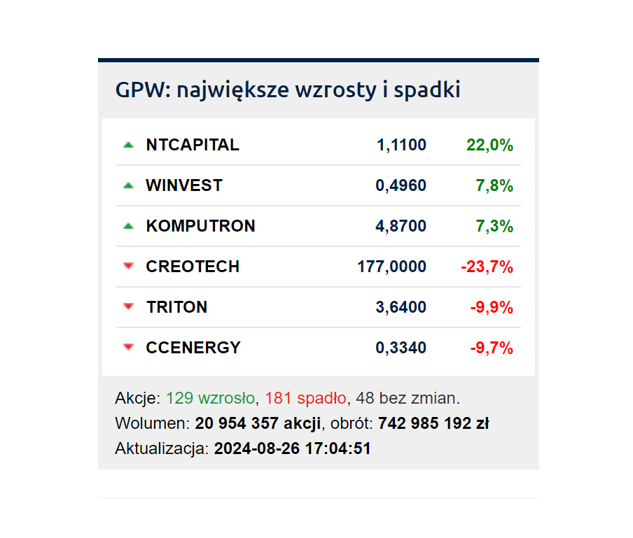 Z niższych segmentów rynku warto zwrócić uwagę na Grupę Azoty (0,69 proc.), która opublikowała szacunkowe wyniki, po tym jak w piątek przesunęła publikacje pełnego raportu na 11 września