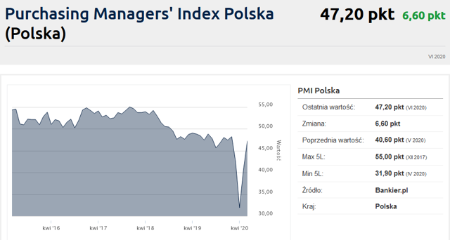 Niemniej jednak jest to wynik aż o 6,6 pkt wyższy niż w maju oraz rezultat istotnie wyższy od oczekiwanych przez ekonomistów 46,5 punktów. To także odczyt wyraźnie lepszy od wskazań za marzec, kwiecień i maj, gdy polski PMI notował rekordowo niskie wartości. Był to także drugi (po majowym skoku o 8,7 pkt) miesięczny wzrost tego wskaźnika.