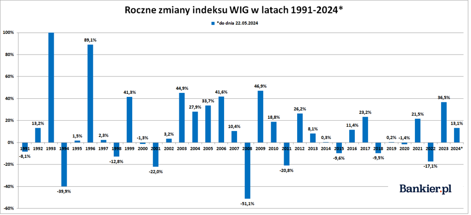 W momencie pisania tego artykułu wartość WIG-u wynosiła 88 235,64 pkt. Do pierwszej „setki” brakowało więc nieco ponad 13%. Czy to dużo? Jeśli weźmiemy pod uwagę zeszłoroczną stopę zwrotu (+36,5%), to raczej nie. Tyle że od początku 2024 roku WIG zyskał już 13,1%. Musiałby zatem w drugim półroczu powtórzyć wynik z pierwszych miesięcy roku, co już takie proste nie jest. Zwłaszcza jeśli przypatrzymy się rocznym wynikom naszego indeksu na przestrzeni minionych 23 lat.
