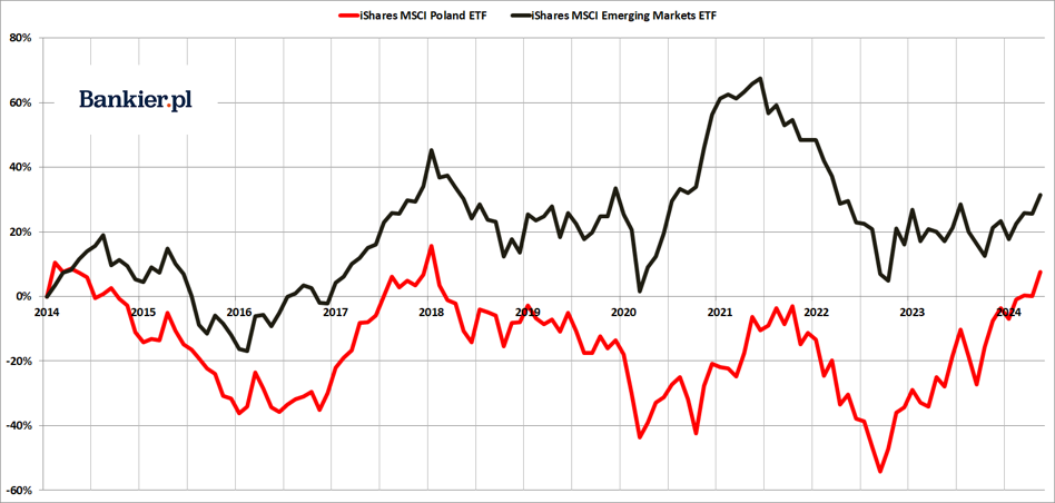 Tutaj w grę wchodzą jeszcze zmiany „koszykowe”. W marcu 2022 roku Rosja wypadła z koszyka rynków wschodzących, ponieważ w ramach sankcji za napaść na Ukrainę została odcięta od światowych rynków kapitałowych. W ostatnim czasie taka pełzająca banicja spotkała aktywa chińskie, które dla wielu inwestorów instytucjonalnych (zwłaszcza z USA) stały się „nieinwestowalne”. Część obawia się, że chińskie akcje może w pewnym momencie spotkać to samo, co akcje rosyjskie. Z drugiej strony coś w tych funduszach „emerdżingowych” trzeba przecież trzymać, a to oznacza relatywnie większą ekspozycję na walory z GPW.