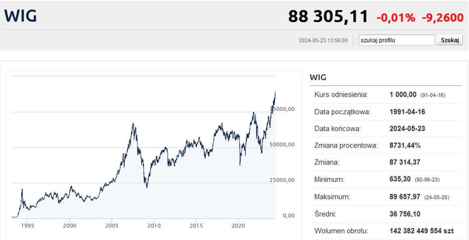20 maja 2024 roku WIG zameldował się na poziomie 89 657,97 punktów, po raz kolejny w tym roku poprawiając historyczne maksima. Najstarszy indeks polskiej giełdy znajduje się już niemal dwa razy wyżej niż w dołku bessy w październiku 2022. Zbliża się też do coraz bardziej „okrągłych” poziomów. 90 tysięcy wydaje się być na wyciągnięcie ręki. Pójdźmy jednak o kilka kroków dalej i zapytajmy: a kiedy sto tysięcy?