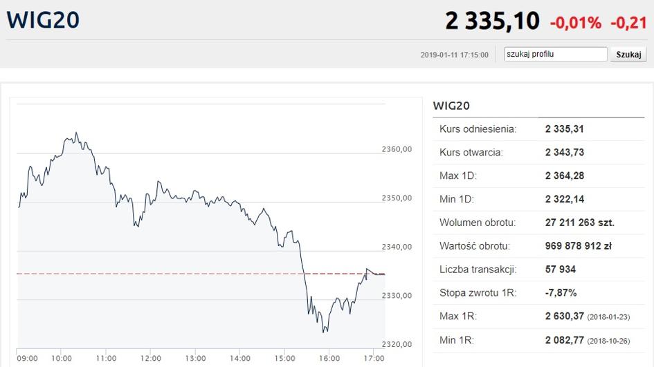 | WIG 20 | Polska | 2335,10 | -0,01 | 2,19 | 5,12 | -7,87 | 2,57 |