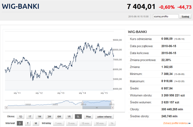 Z rana mocne uderzenie niedźwiedzi zbiło WIG ponownie w pobliże czerwcowego minimum. Ciężarem dla rynku były przede wszystkim akcje banków. Notowania Handlowego, Millennium i BOŚ podczas wtorkowej sesji wyznaczyły roczne minima. Niebezpiecznie blisko rocznego denka znalazły się też notowania PKO BP, które osunęły się o 1,5%. Indeks WIG-Banki stracił 0,6%.