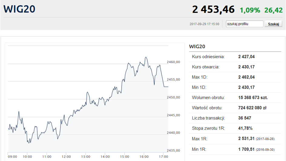 | WIG 20 | Polska | 2453,46 | 1,09 | -1,10 | -1,77 | 41,78 | 25,95 |