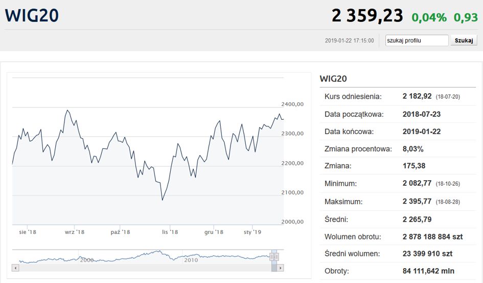 | WIG 20 | Polska | 2359,23 | 0,04 | 0,63 | 4,40 | -9,98 | 3,63 |