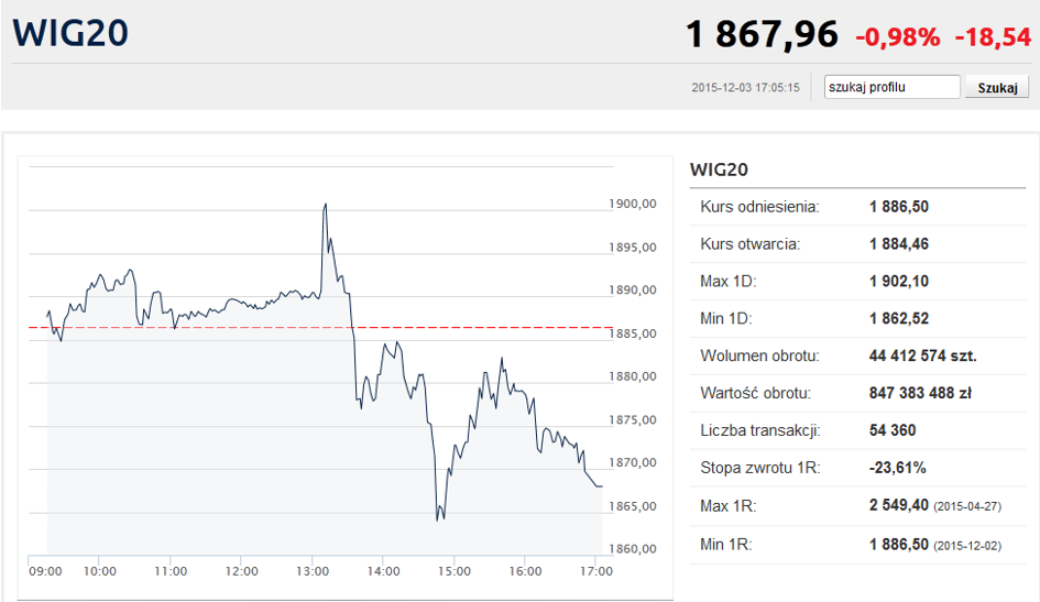 WIG20 zamknął czwartkową sesję z wynikiem 1.867,96 punktów, czyli 0,98% poniżej środowego zamknięcia. W trakcie sesji indeks blue chipów wyznaczył nowe minimum schodząc do 1862.52 pkt., a więc najniżej od czerwca 2009 roku.