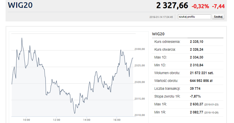 | WIG 20 | Polska | 2327,66 | -0,32 | -0,16 | 1,05 | -8,33 | 2,24 |