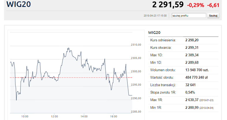| WIG 20 | Polska | 2291,59 | -0,29 | -0,37 | 1,52 | 1,22 | -6,89 |