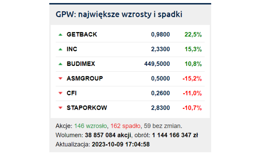 Pod kreską były tylko wciąż słabe walory Allegro (-1,76 proc.), które nie mogą się podnieść po ogłoszonej w czwartek sprzedaż akcji w ABB i Pepco (-2,65 proc.), które jest w silnym trendzie spadkowym od wielu miesięc i na chwilę tylko odbija, jak miało to miejsce np. w piątek. Minimalnie pod kreską był też kurs Asseco (-0,47 proc.).