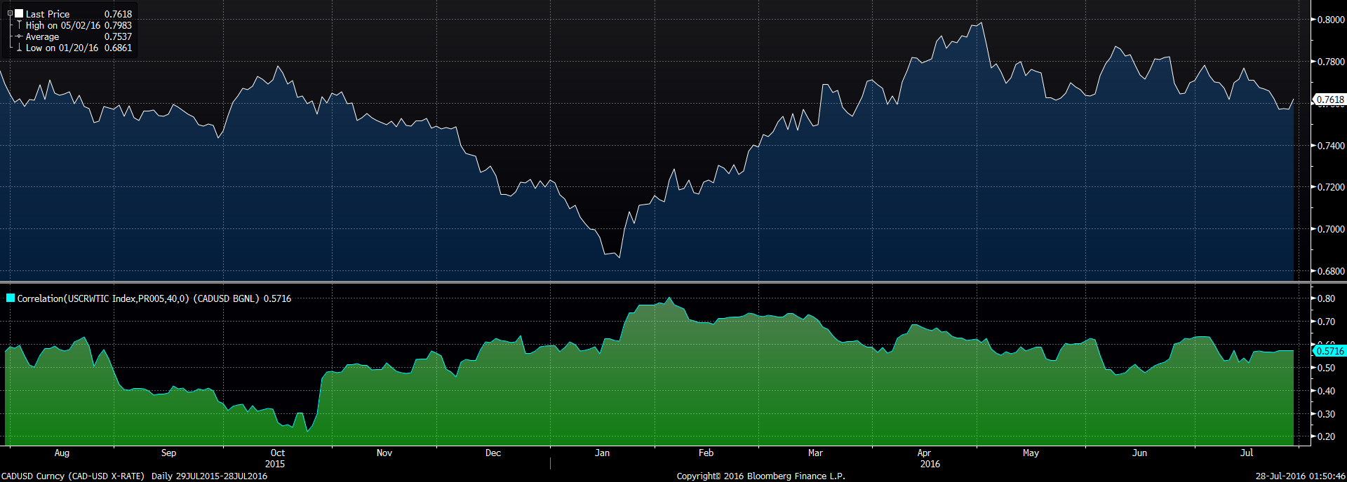 Należy też zwrócić uwagę, że spadająca ropa naftowa tylko poniekąd naruszyła siłę dolara kanadyjskiego, niewątpliwie jest to bardzo dobry sygnał, bynajmniej dalsza, nagła wyprzedaż „czarnego złota" doprowadzi w dłuższym terminie do osłabienia się dolara kanadyjskiego względem amerykańskiego. Poniżej przedstawiono korelacje pary walutowej CAD/USD z ropą WTI, która obecnie jest powyżej 0.57, oznacza to, że ropa naftowa i dolar kanadyjski przez 57% czasu porusza się w tym samym kierunku.