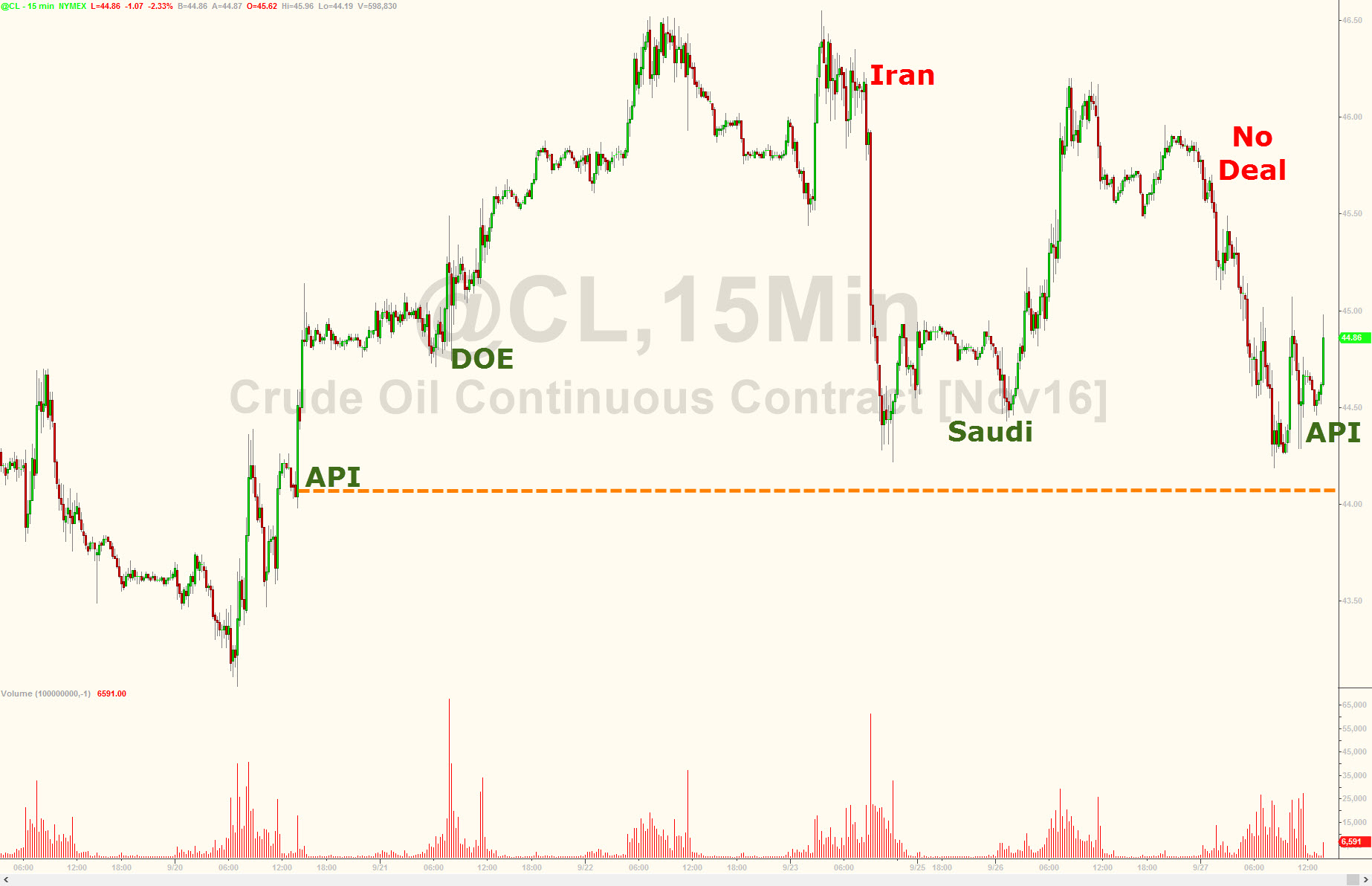 Na rynku ropy naftowej cały czas mamy do czynienia z bardzo mocnymi wahaniami. Raz w dół raz w górę. Ostatnia zmienność na rynku czarnego złota napędzana jest przez dwa czynniki. Pierwszym z nim są publikacje zapasów ropy naftowej API oraz DOE. Natomiast drugim wypowiedzi przedstawicieli Iranu oraz Arabii Saudyjskiej o możliwym zamrożeniu produkcji ropy naftowej. Wszystko zostało opisane na wykresie poniżej.