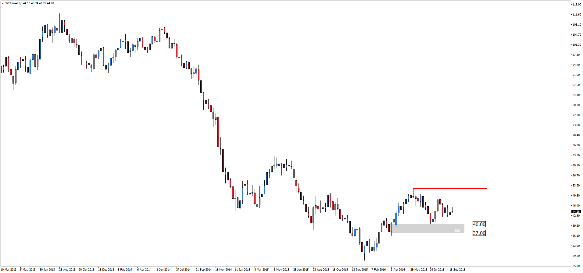 Spoglądając na wykres tygodniowy możemy spodziewać się dalszej konsolidacji na wykresie pomiędzy strefą wsparcia 37.00-40.00, a strefą oporu w okolicy 51 USD za baryłkę. Spotkanie największych producentów już dzisiaj, jednakże do porozumienia prawdopodobnie nie dojdzie.