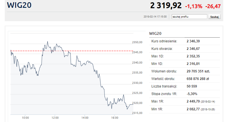 | WIG 20 | Polska | 2319,92 | -1,13 | -2,17 | -0,33 | -5,30 | 1,90 |