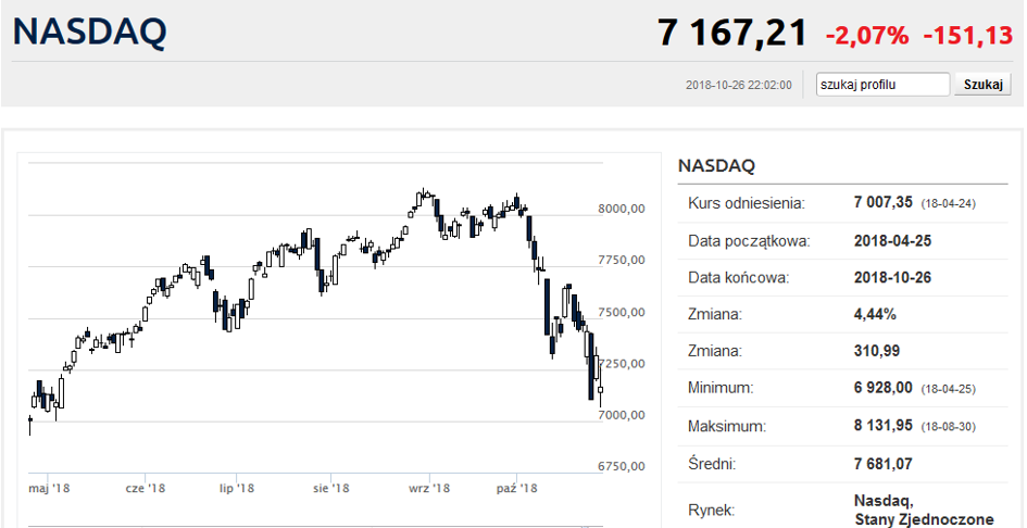Dow Jones Industrial zniżkował 1,19 proc., kończąc notowania na poziomie 24.688,3 pkt. S&P 500 spadł o 1,73 proc. i wyniósł 2658,7 pkt. Z 20 październikowych sesji piętnaście indeks zakończył na minusie. Nasdaq Comp. zniżkował 2,07 proc., do 7.167,21 pkt.