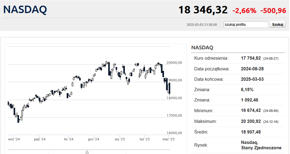 Indeks Nasdaq Composite zakończył poniedziałkową sesję spadkiem aż o 2,64% i zakończył dzień na poziomie 18 350,19 punktów. Był to najniższy od czterech miesięcy kurs zamknięcia. S&P500 zniżkował o 1,76% i zatrzymał się na wysokości 5 849,72 pkt. Dow Jones stracił 1,48% i finiszował z wynikiem 43 191,24 pkt.