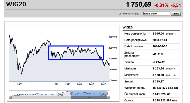 Boczny trend dobrze znany jest inwestorom znad Wisły. Wprawdzie obecnie przy Książęcej trwa bessa, jednak w latach 2011-2015 WIG20 miał wyraźny problem z wyborem konkretnego kierunku. Indeks posuwał się w bok w kanale o zasięgu około 600 punktów. Dodatkowo ruchowi temu towarzyszyły, szczególnie w ostatniej fazie trendu, niskie obroty, co rodziło wrażenie, iż na rynku panuje marazm. Dla inwestorów liczących na zyski z okresu dłuższych wzrostów, bądź czekających na tańsze akcje nie były to z pewnością łatwe czasy.