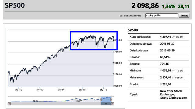 W maju 2015 roku indeks S&P wspiął się na poziom 2134 punktów. Od czasu wyznaczenia rekordu wciąż znajduje się on blisko maksimów, jednak nie może ich poprawić. Konsolidacja na Wall Street trwa.