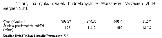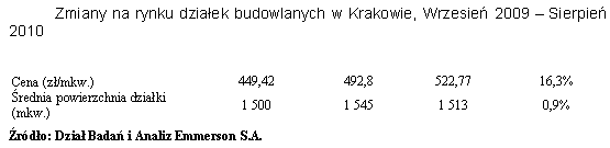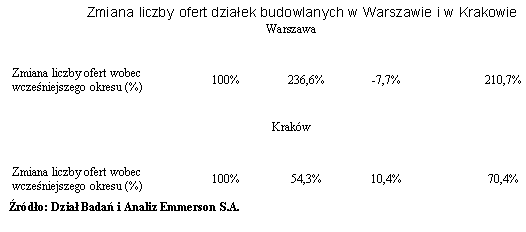 Przyjmując za stan wyjściowy wrzesień 2009 w Warszawie w ciągu ostatniego roku odnotowano wzrost liczby ofert sprzedaży działek budowlanych o powierzchni nieprzekraczającej 5 000 mkw. aż o 210,7%. Tak duży wzrost jest oczywiście rezultatem tzw. niskiej bazy, a więc jest spowodowany stosunkowo niewielką liczbą ofert pojawiających się na rynku w poprzednim roku. W tym samym czasie w Krakowie wzrost ten wyniósł 70,4%. Co ciekawe w przypadku obydwu miast zmiany liczby ofert zanotowane w sierpniu były bądź stosunkowo niewielkie, bądź też znajdowały się na ujemnym poziomie. Przedstawiona tendencja odnośnie zmiany liczby ofert ma pozytywny wydźwięk przez co współgra z danymi ukazującymi wzrost cen i średniej powierzchni działek oferowanych do sprzedaży. Taki rozwój wydarzeń na rynku można tłumaczyć wzrostem popularności wśród mieszkańców obydwu miast zakupu działki budowlanej i rozpoczęcia budowy domu na własną rękę.