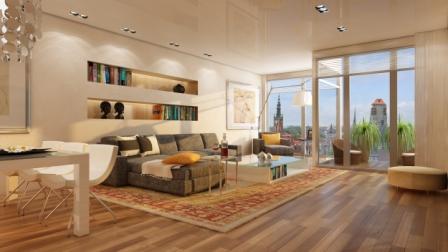Strefa dzienna apartamentu z widokiem na Stare Miasto w Gdańsku