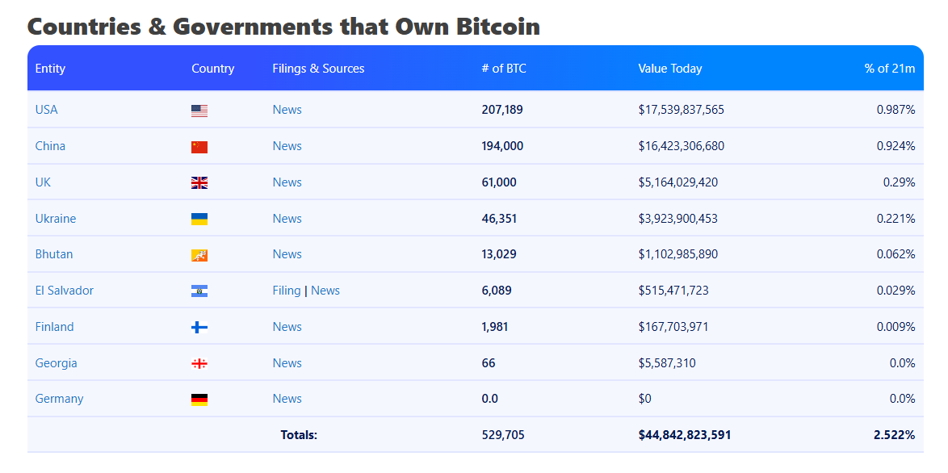 Według danych portalu bitcointreasuries.com władze centralne Chin posiadają szacunkowe 194 tys. bitcoinów przejęte po rozbiciu piramidy finansowej PlusToken w 2019 r. Wśród innych państw więcej mają jedynie Stany Zjednoczone. W większości przypadków państwowe bitcoiny stanowią skonfiskowane kryptowaluty w wyniku wykrycia przestępstw. Wyjątkiem jest Salwador, który w 2021 r. uznał bitcoina za prawny środek płatniczy i za publiczne środki kupował go na rynku.
