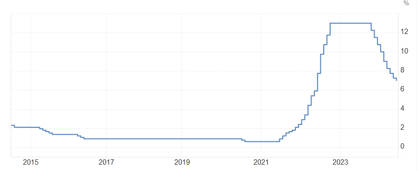 Była to już dziewiąta z rzędu obniżka stóp procentowych na Węgrzech. Wcześniej, od września 2022 roku do października 2023 roku, MNB utrzymywał główną stopę procentową na poziomie 13%, a więc na najwyższym poziomie w XXI wieku. Jeszcze wyższa była stopa procentowania jednodniowych kredytów (odpowiednik stopy lombardowej), którą w październiku 2022 roku w trybie awaryjnym wyniesiono do poziomu aż 25%. Był to ruch wymuszony wówczas przez gwałtowną deprecjację forinta i zmasowany odpływ kapitału zagranicznego.