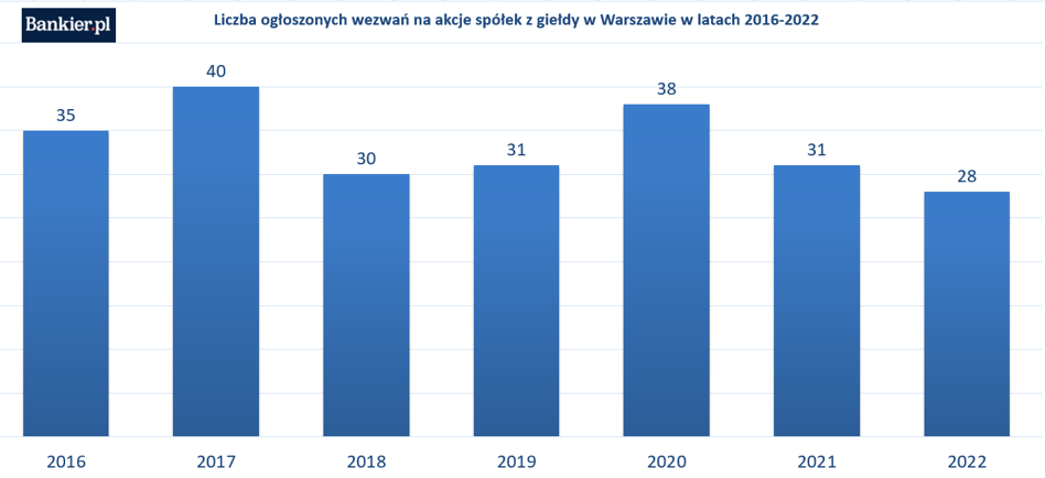 W poprzednim roku ogłoszono 28 wezwań na skup akcji spółek z GPW i NewConnect. W poprzednich latach liczba wezwań zawsze przekraczała 30. Nie zawsze ten proces pozwala na osiągnięcie progu 95 proc. w akcjonariacie i tzw. przymusowy wykup, by ściągnąć spółkę z giełdy. Czasami może to trwać przez kilka lat poprzez wiele wezwań, bez gwarancji sukcesu jak np. w przypadku Gobarto, którego z giełdy chce ściągnąć Cedrob.