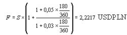 Obliczyć cenę teoretyczną kontraktu terminowego na 10.000 USDPLN wygasającego za trzy miesiące, jeżeli kurs kasowy wynosi 2,2000 USDPLN, a stopa procentowa u dla dolara amerykańskiego wynosi 3% a dla złotego 5%.