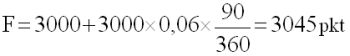 W dniu A wartość indeksu WIG20 wynosi 3000 pkt. Stopa procentowa wolna od ryzyka wynosi 6%. Wartość teoretyczna kontraktu terminowego na ten indeks, wygasającego za trzy miesiące wynosi: