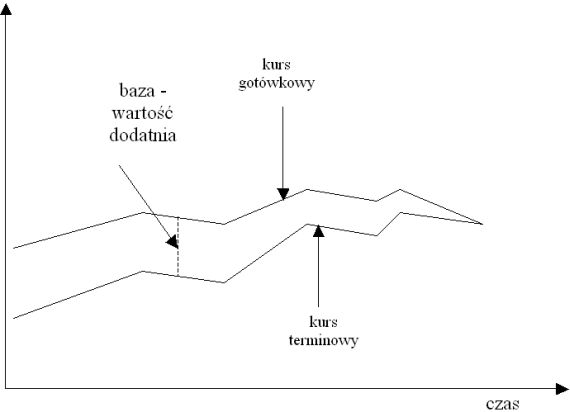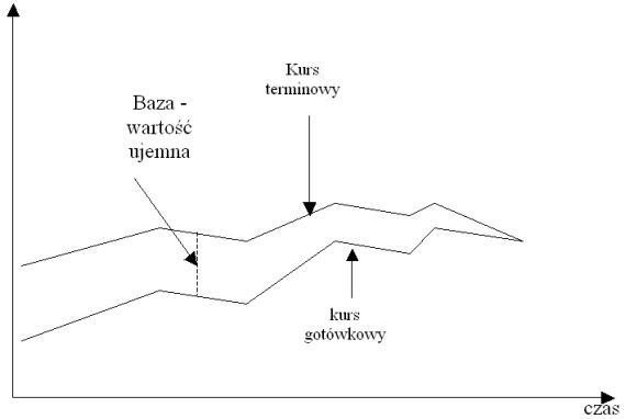 W przypadku, gdy kurs kontraktu terminowego jest wyższy od ceny gotówkowej, baza ma wartość ujemną (contango) i odwrotnie – niższy kurs terminowy od ceny gotówkowej implikuje dodatnią wartość bazy (backwardation). Na poniższych dwóch wykresach przedstawiono kształtowanie się wielkości bazy o wartościach ujemnych oraz o wartościach dodatnich w zależności od upływu czasu.