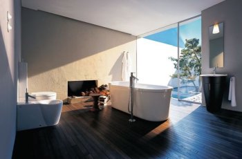 Pojedyncza lampa sufitowa – najczęściej w postaci płaskiej plafoniery – jest nieco mniej praktyczna. Niekiedy jednak wymaga jej aranżacja wnętrza; wszak w łazienkach „salonowych” pozwalamy sobie nawet na kryształowe żyrandole. Wówczas należy szczególnie dokładnie przemyśleć oświetlenie boczne: punktowe, liniowe lub strefowe. Ważne, by rozmieszczenie opraw oświetleniowych ułatwiało korzystanie ze wszystkich łazienkowych urządzeń, a także umożliwiało kreowanie zróżnicowanych planów i nastrojów.