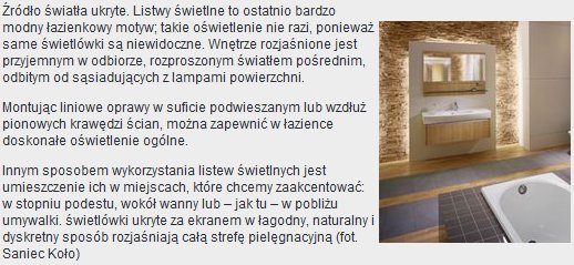 Nie znaczy to, że na rachunki za energię musimy wydawać majątek – mnożąc punkty świetlne możemy, a nawet powinniśmy znacząco ograniczyć moc poszczególnych lamp. Świecąc w kompletnym zestawie, wystarczająco rozjaśnią wnętrze, a selekcjonowane – pozwolą wygodnie wykonać wszystkie czynności sanitarno-toaletowe. No i stworzą klimat… a któż z nas nie marzy o nastrojowej kąpieli w półmroku, wśród woni eterycznych olejków?
