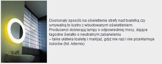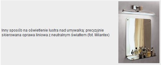 Efekt ten pozwolą uzyskać kinkiety po bokach lustra (umieszczanego z reguły nad umywalką) o mlecznych oprawach, z żarówkami o mocy nie większej niż po 60 W każda. Ponieważ im więcej punktów świetlnych, tym lepiej (rozpraszają cienie, oświetlając równomierniej), dobrym rozwiązaniem będzie kilka słabszych żarówek umieszczonych na obwodzie lustra.