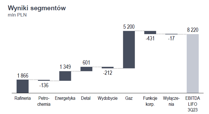 Segment rafinerii wypracował zysk EBITDA LIFO w wysokości 1,9 mld zł. Z tego 221 mln zł to wynik przejętej Grupy LOTOS. Na rezultat osiągnięty przez ten obszar wpłynęło negatywnie otoczenie makroekonomiczne, w tym: zmiana struktury przerabianych rop związana z odejściem od rosyjskiego surowca, co przełożyło się na spadek dyferencjału o 8,4 USD/bbl (r/r).