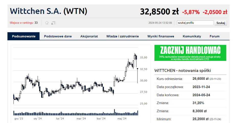 Z kolei najbardziej negatywny efekt dla giełdowego kursu miał raport wynikowy Wittchena. Spółka zanotowała pogorszenie we wszystkich kluczowych pozycjach rachunku zysków i strat. Przychody przez rok spadły o 3,5 proc., wynik EBITDA był gorszy już o 27 proc., wynik operacyjny spadł o 45 proc., a sam zysk więcej niż przepołowił się w porównaniu z I kwartałem roku ubiegłego i spadł do 4,9 mln zł. W ujęciu kwartał do kwartału zysk spadł aż o 76 proc. Tym samym kurs spadł na otwarciu sesji poniżej 30 zł za akcję, czyli o 15 proc. Potem odrobił część strat i po południu oddawał ok. 6 proc.