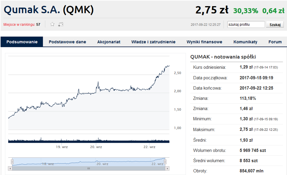 Handel akcjami Qumaka został zawieszony o 12:25 przy kursie 2,75 zł, co oznaczało zwyżkę o ponad 30 proc. względem czwartkowego zamknięcia. I to przy stosunkowo wysokich obrotach, przekraczających 3 ml zł. O 12:58 walory spółki wciąż były równoważone, przy teoretycznym kursie otwarcia wynoszącym 2,77 zł.