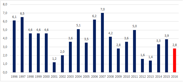 W 2016 r. wchodziliśmy z prognozami mówiącymi o około 3,8% (tyle zapisano też w budżecie), jednak kolejne negatywne informacje – zwłaszcza te dotyczące tempa inwestycji – solidnie studziły zapał kolejnych prognostów. W podobnym kierunku szły rewizje prognoz banków czy agencji ratingowych.