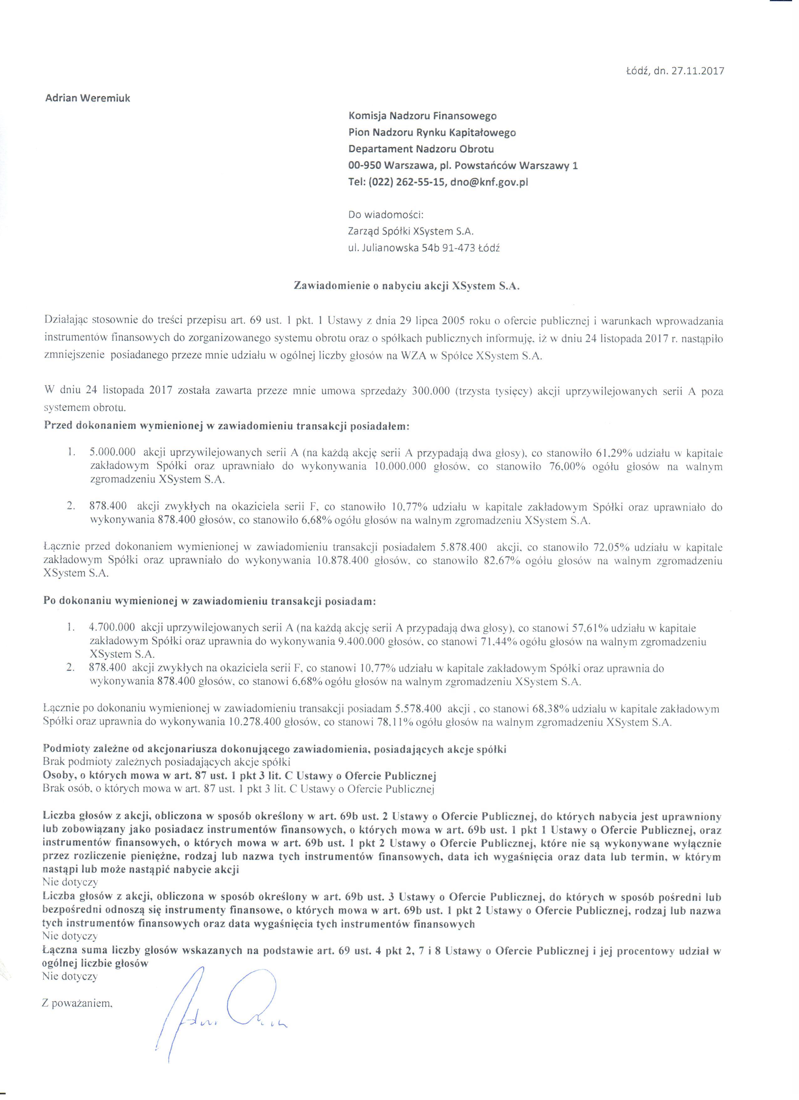 | Zarząd XSystem S.A. z siedzibą w Łodzi (dalej: Spółka) informuje, iż w dniu 27 listopada 2017 r. Spółka otrzymała zawiadomienie w trybie art. 69 Ustawy z dnia 29 lipca 2005 r. o ofercie publicznej i warunkach wprowadzania instrumentów finansowych do zorganizowanego systemu obrotu oraz o spółkach publicznych od akcjonariusza – pana Adriana Weremiuka. | |||||||||||