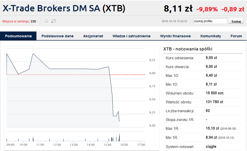 Zdaniem zarządu XTB „obserwowana w okresie dziewięciu miesięcy 2016 roku wyraźnie niższa zmienność na rynkach, w porównaniu do analogicznego okresu roku poprzedniego, stworzyła mniej możliwości inwestycyjnych klientom XTB. W konsekwencji, podobnie jak u konkurencji o tożsamym modelu biznesowym, nastąpił spadek obrotu klientów instrumentami finansowymi, a co za tym idzie, także przychodów Grupy” – twierdzi zarząd X-Trade Brokers.