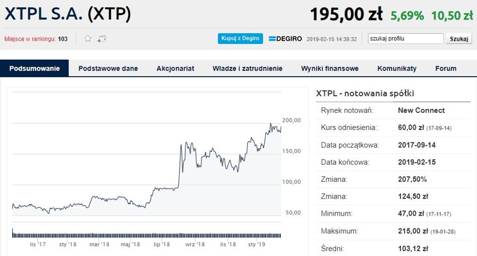 Już 20 lutego 2019 roku odbędzie się pierwsze notowanie XTPL na głównym parkiecie GPW. Wrocławska spółka zaledwie kilkanaście miesięcy temu debiutowała na NewConnect i w tym czasie zdążyła się już stać jednym z największych inwestycyjnych hitów na warszawskiej giełdzie. XTPL wchodziło na rynek przy kapitalizacji nieco ponad 100 mln zł, a przenosi się na parkiet główny z kapitalizacją wyraźnie przekraczającą 300 mln zł.